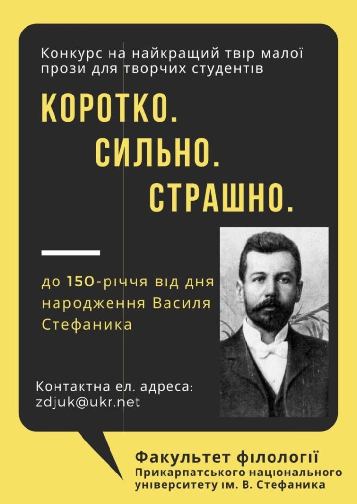Конкурс для творчих студентів на найкращий твір малої прози “Коротко. Сильно. Страшно”, оголошує факультет філології Прикарпатського національного університету імені Василя Стефаника. Авторські роботи надсилати до 10 квітня 2021 р. на адресу доцентки кафедри української мови Оксани Ципердюк – zdjuk@ukr.net Переможці будуть нагороджені дипломами Читати далі