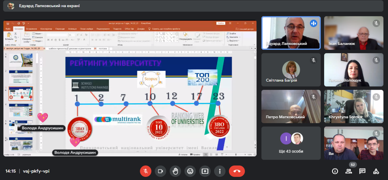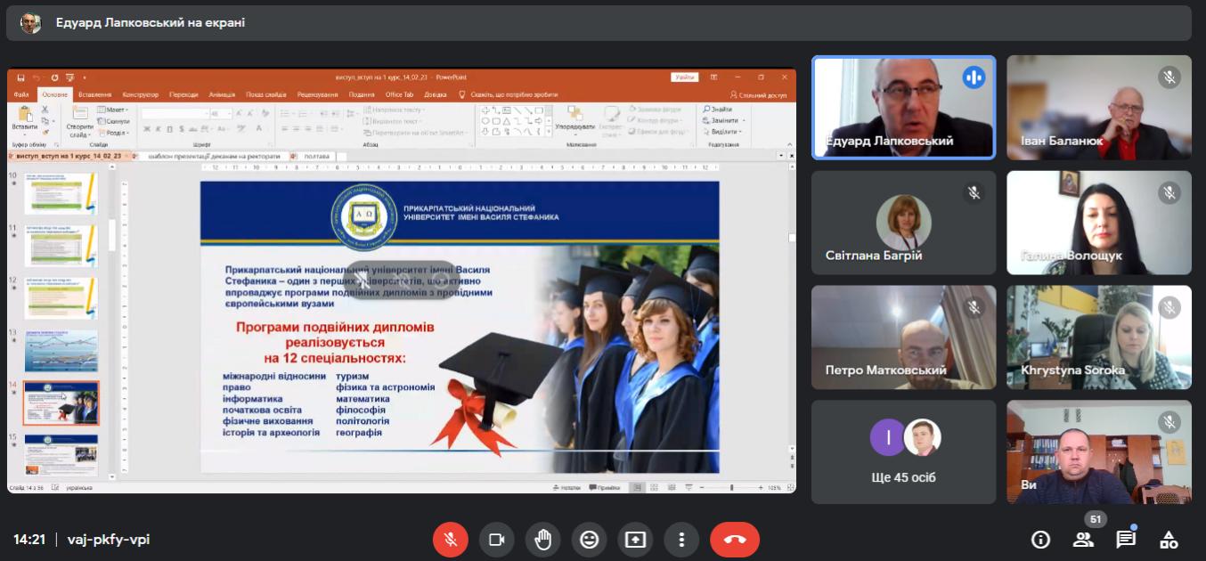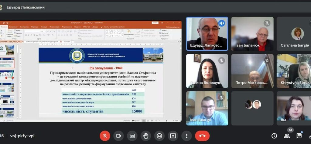 Свій навчальний заклад презентували проректор з науково-педагогічної роботи, відповідальний секретар Приймальної комісії доц. Лапковський Е.Й. та відповідальна за проведення профорієнтації від Прикарпатського національного університету доц. Волощук Г.М., які розповіли про рейтинг Університету серед закладів вищої освіти України, про особливості та переваги навчання в Університеті, висвітлили новинки вступної кампанії 2023 року, ознайомили з можливостями і перспективами майбутніх студентів Університету, їх умовами навчання, проживання та студентським дозвіллям. Проректор наголосив, що у студентів Університету є можливість сповна реалізувати себе, зростати професійно та творчо. Університет є учасником програм академічних обмінів, якими вже скористалося чимало студентів, аспірантів і викладачів, тут є можливість отримати подвійні дипломи, пройти підвищення кваліфікації чи стажування у партнерів Університету – наукових та освітніх установах Європи та світу.