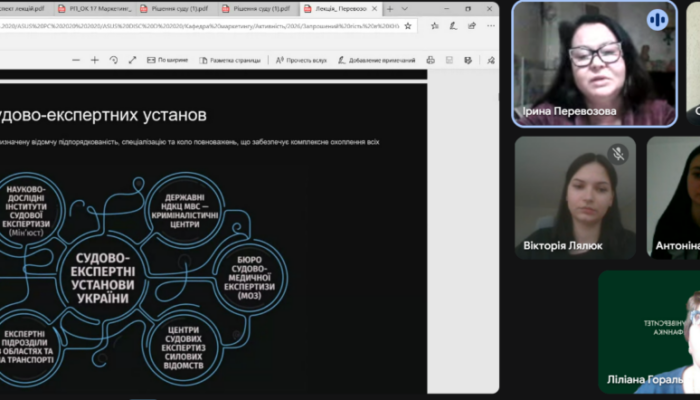 Тема лекції, обрана відповідно до Силабусу дисципліни, «Економічна експертиза в системі судово-експертної діяльності», дозволила студентам та всім присутнім здобути нові й поглибити існуючі знання щодо судової економічної експертизи, яка, за словами проф. Перевозової І. В., являється ДНК дослідження бізнесу. Ірина Володимирівна акцентувала увагу присутніх на структурі судово-експертних установ, правовій регламентації судово-експертної діяльності, класифікації судових експертиз. Особливий акцент було поставлено на системі експертних спеціальностей, серед яких особливе місце посідають фінансово-кредитні операції (спеціальність11.3). Практичні кейси, запропоновані лектором, викликали жваву дискусію, в якій взяли участь студенти Олег Кузів, Лялюк Вікторія, Соломія Ганчарик.
